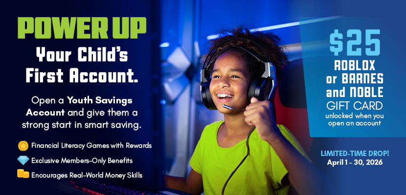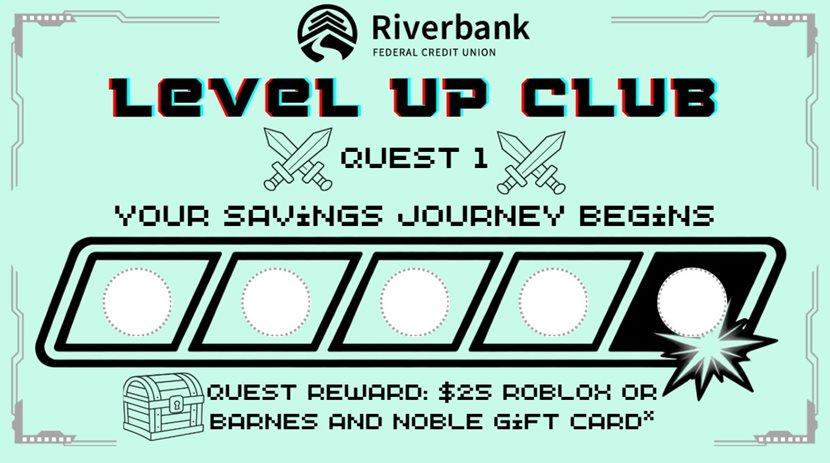 April is Youth Savings Month at Riverbank Federal Credit Union! We want to help you ensure your child reaches every level possible in the game of money. A Youth Savings Account is the first step in building strong financial habits across their lifetime. No cheat-codes required! Opening your child’s Riverbank Youth Savings Account between April 1-30 will unlock your choice of a $25 Roblox gift card or a $25 Barnes & Noble gift card.